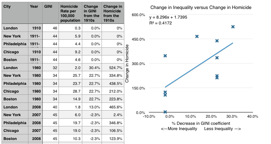 Turns out that inequality reduces crime, and equality increases crime. For every 10% decline in inequality according GINI coeffecient, homicide nearly doubles! That is a very strong correlation. (You can download my spreadsheet here).